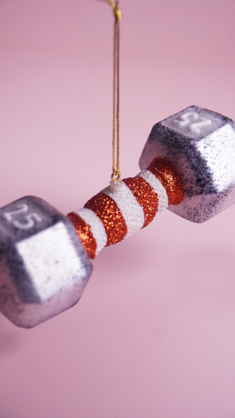 Description: Stoere kerstbal in de vorm van een dumbbell, voor fitnessliefhebbers.