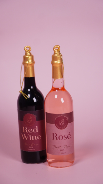 Description: Luxe kerstballen in de vorm van een fles rode wijn en fles rose, perfect voor wijnliefhebbers.