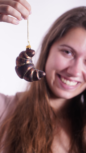 Description: Gedetailleerde kerstbal in de vorm van een krokante croissant.