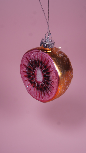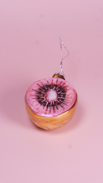 Description: Felroze kiwi kerstbal, een frisse en originele toevoeging aan de boom.